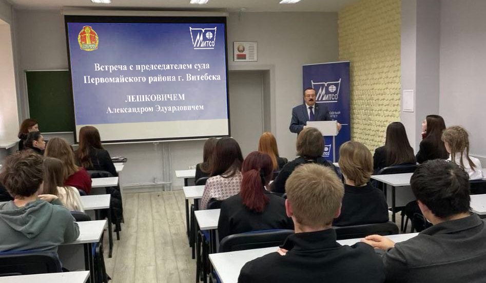 15 октября в Витебском филиале Международного университета "МИТСО" состоялась встреча студентов 1, 2, 3 курсов специальности "Правоведение" с председателем суда Первомайского района г. Витебска Лешковичем Александром Эдуардовичем.